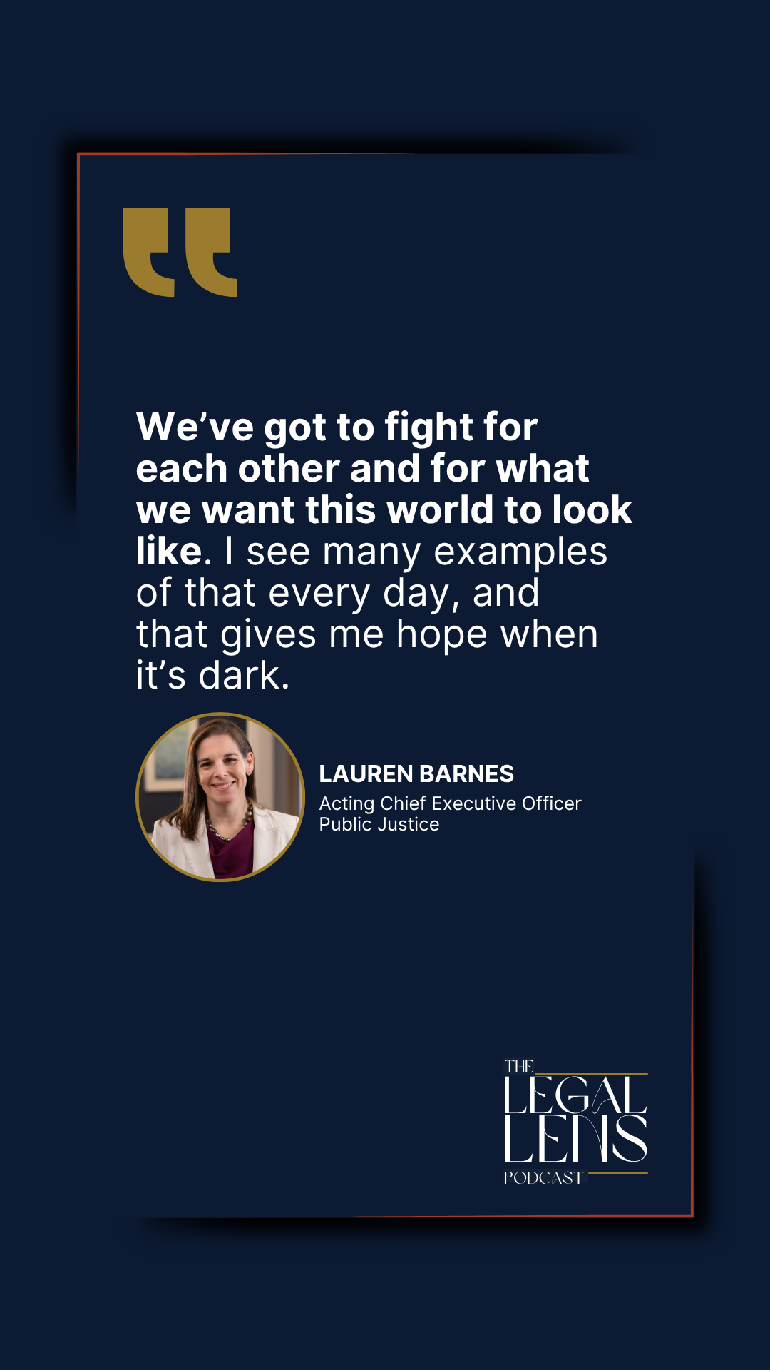 I was honored to welcome Attorney Lauren Barnes to the Legal Lens podcast this week. As the Acting Chief Executive Officer of Public Justice, Lauren is a veteran complex litigator who has spent decades holding powerful interests accountable. Her work sits at the critical intersection of litigation and advocacy, focusing on how we can use the legal system to dismantle systemic oppression.